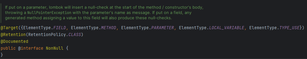 - 롬복의 @NonNull을 예시로 들수 있다.