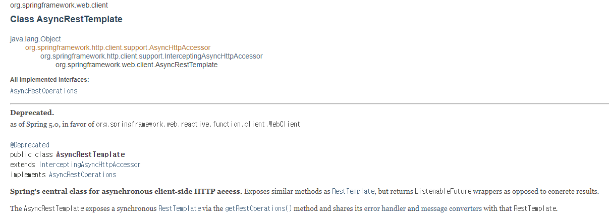 AsyncRestTemplate은 스프링 5 버전에서 조용히 퇴장하게 됩니다. 왜죠? 분명히 RestTemplate의 단점을 보완해서 나왔는데 사라지다니...